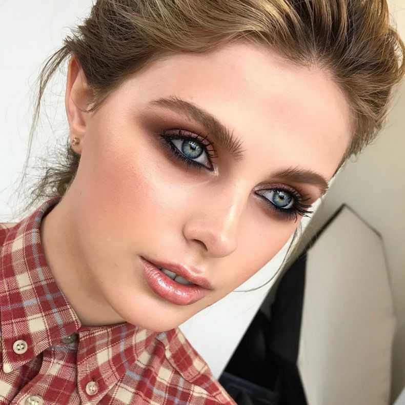 Любители яркого акцента на глазах могут воспользоваться мерцающими тенями. Оставить светлыми внутренние уголки глаз и места под бровями. Завершить мейкап подводкой и тушью для создания дополнительного объема и подходящим макияжем губ.