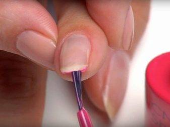 Удалите избытки жидкости и осторожно промажьте кромку ногтевой пластины, держа кисточку в перпендикулярном положении, волосяным пучком к кончику пальца. Это даст возможность предупредить отслаивание маникюра от пластины ногтя.