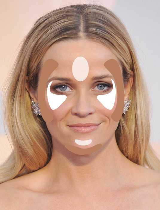 Смягчить некоторую угловатость лица прямоугольного типа можно при помощи макияжа. Основным приемом коррекции в этом случае становится высветление центральной части лица и затемнение боковых поверхностей. Зоны высветления и затемнения для коррекции демонстрирует следующая схема макияжа: