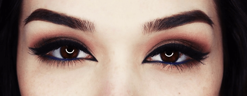 Тушь, подводка и кайал — угольно-черные. На нижнем веке можно поставить золотой или медный блик.