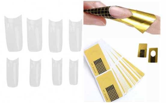 Помимо этого, ноготки можно наращивать как на типсы, так и на формы. Типсы представляют собой материал, изготовленный в виде искусственных пластин, их обычно применяют при работе с гелем, поскольку акрил обеспечивает прочность пластинам и без них. Типсы отличаются жёсткостью и чем выше их эластичность, тем натуральнее смотрится маникюр. Формы являются шаблоном, их подставляют под край ноготка для выкладки акрила или геля. Работа с формами происходит дольше, занимает в среднем до 2 часов, так как заливка материала требует аккуратности.