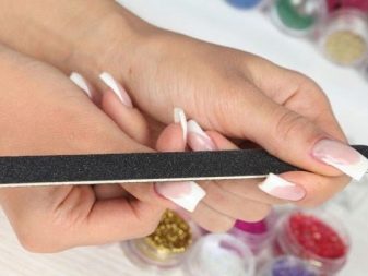Просушивание слоев сигнализирует, что пора опиливать и шлифовать. Для создания френча наносят пудру, затем прозрачный гель-лак и просушивают лампой.