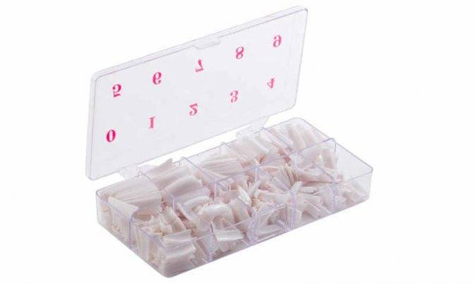 Они представляют собой шаблоны из пластика, приклеиваемые к краешку ногтевой пластины, создают поверхность для акрилового покрытия. Различаются по наличию контактного участка, по форме и расцветке. В типсах выделяют 3 зоны: свободный краешек, самый тоненький, формирующий кончик и пространство в форме выемки, что накладывается на ноготок. Ценится выбор шаблонов, что сочетаются с типом ноготков, в противном случае не получится процедура.