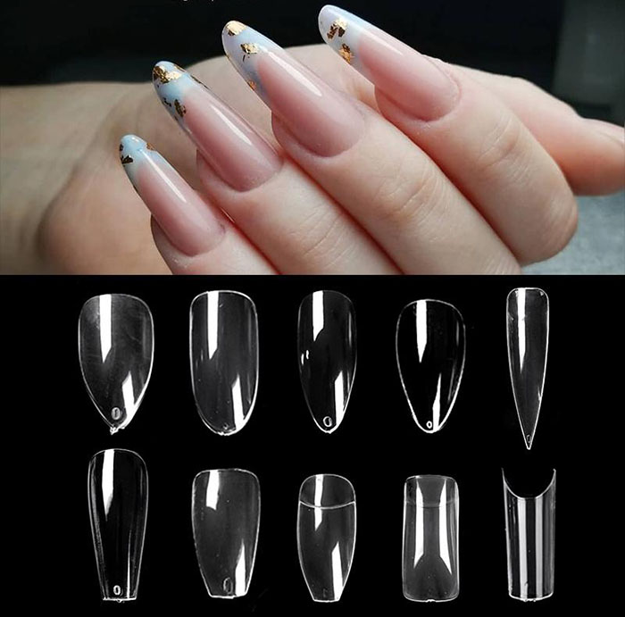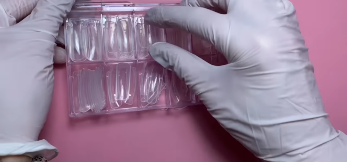 - Подобрать изделия, оптимально подходящие преображаемым ногтям. Такие накладки должны полностью закрывать натуральные пластины, плотно к ним прилегая.
