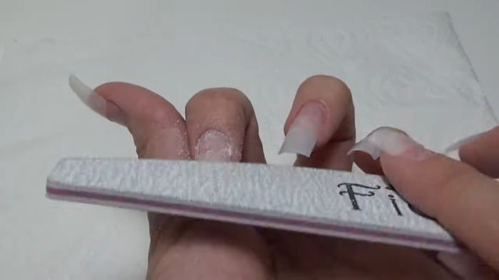 Завершающий этап нанесения полигеля – сглаживание поверхности с помощью пилки. Ею же заканчиваем формировать ноготок.