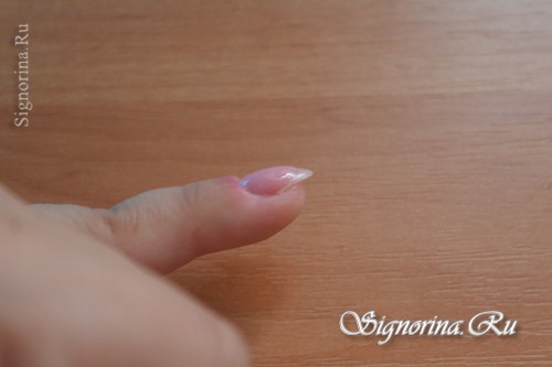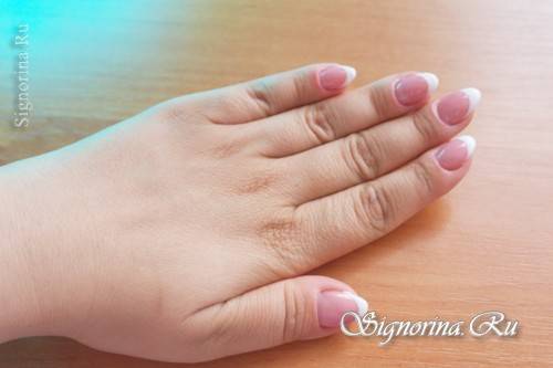 1) Если у вас уже были нарощенные гелевые ногти, то их нужно подготовить к коррекции: снять цветной гель-лак, удалить отслойки, обработать ногтевую пластину в зоне лунки, запилить синусы и придать ногтю желаемую форму. Если вы наращиваете ногти впервые, то вначале запиливается ногтевая пластина натурального ногтя, подготавливается к наращиванию, затем наращиваются ногти на формы, сушатся, и им придаётся желаемая форма. В начале выкладывания френча гелем рука выглядит примерно так.