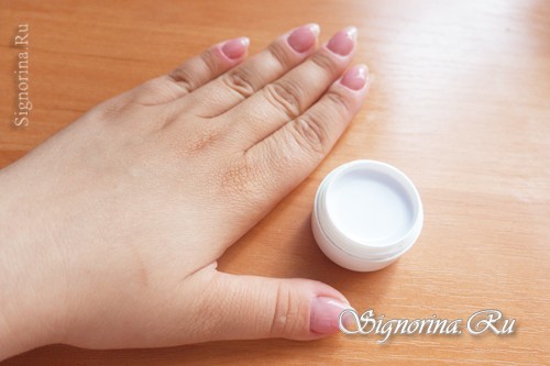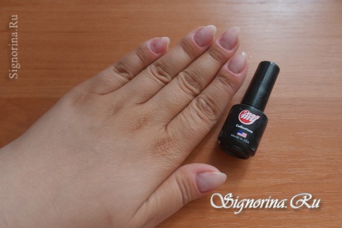 2) Чтобы обеспечить хорошую сцепляемость искусственного материала с натуральным ногтем, обрабатываем ноготь праймером. Я использую безкислотный праймер, это удобно и безопасно, если жидкость попадает на кутикулу.