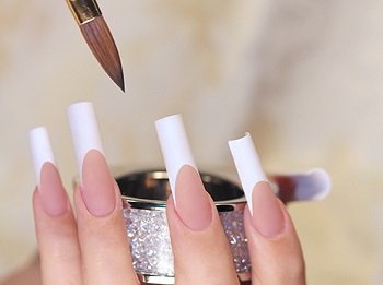 В случае наращивания ногтей на типсах акрилом, сначала наносится полупрозрачный или розоватый акрил, затем осторожно распределяется по ногтевой пластине с помощью кисточки и сушится. Сушка акрила не нуждается в помощи лампы