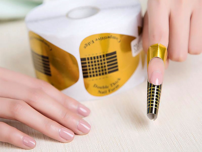 На следующем этапе надеваем форму, лучше взять одноразовую. Перед использованием нужно слегка её согнуть вдоль, придав округлость. Приклеиваем ушки к пальцу и смотрим на вид сбоку, форма должна продолжать естественную линию роста ногтя. Следите за тем, чтобы не было искривления. Если между ногтем остаётся зазор, то форму следует подрезать.