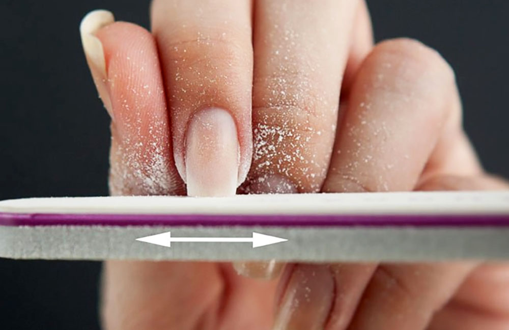 Пилочкой для натуральных ногтей аккуратно запиливаем поверхность пластины, совершая движения на себя. Тщательно подчищаем область возле кутикулы, там находится птеригий, который необходимо полностью убрать. Если его плохо почистить, то наращенный ноготь может отслоиться. Далее подпиливаем свободный край так, чтобы было удобно поставить форму.