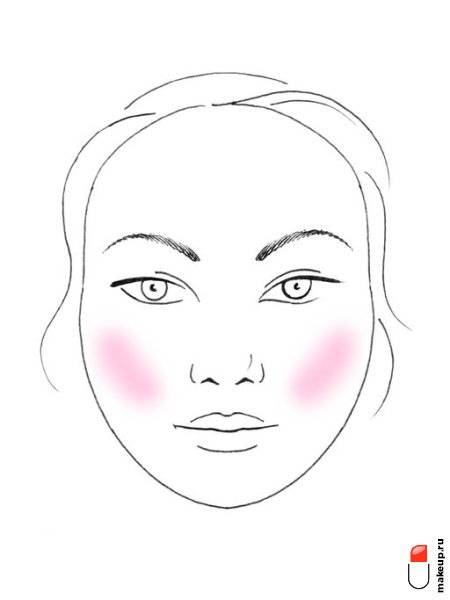 Если у вас круглое лицо, скорее всего, вам хочется немного визуально уменьшить выдающиеся щеки. С помощью румян сделать это очень просто. Сначала нанесите их на «яблочки» щек – для этого улыбнитесь и запомните, где находится самая выступающая часть. Дальше растушуйте румяна, стараясь «увести» пигмент под скулы.