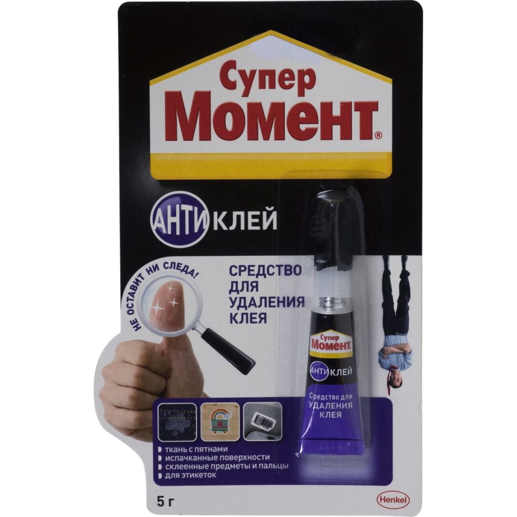 В хозяйственных магазинах продается «Антиклей», упаковка которого похожа на тюбик «Момента». Это средство быстро удаляет следы от суперклея не только с кожи, но и с других поверхностей, в том числе с одежды. «Антиклей» подойдет для ребенка, замаравшегося клеем, так как состав действует эффективно и безопасно.