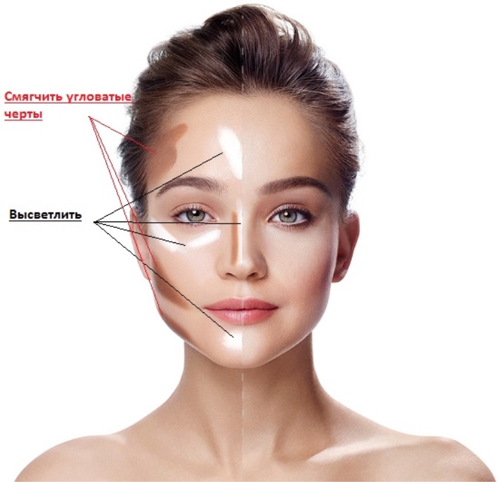 Гармонизировать пропорции квадратного лица у женщин возможно, грамотно высветляя и затемняя определенные его участки