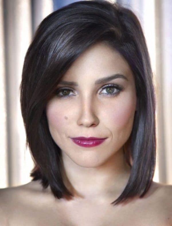 Для того чтобы скрыть широкую часть подбородка и визуально увеличить лоб, можно воспользоваться прямой челкой, а основной объем от стрижки перенести на уровень подбородка. На длинные и средней длины волосы хорошо подойдет слоистая стрижка, имеющая несколько разных длин. С короткими волосами (особенно вьющимися) хорошо будет смотреться боб.