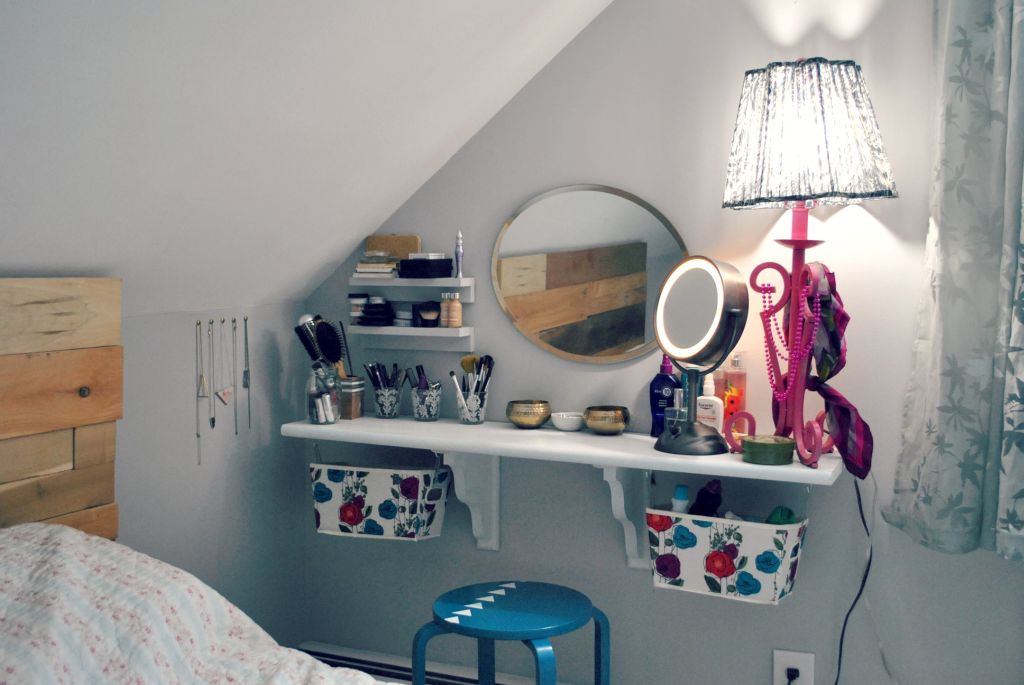 При недостатке места не всегда можно позволить себе настоящий туалетный столик. Не беда! Немного творчества и стильного декора превратят обычную полку в идеальную площадку для нанесения макияжа.