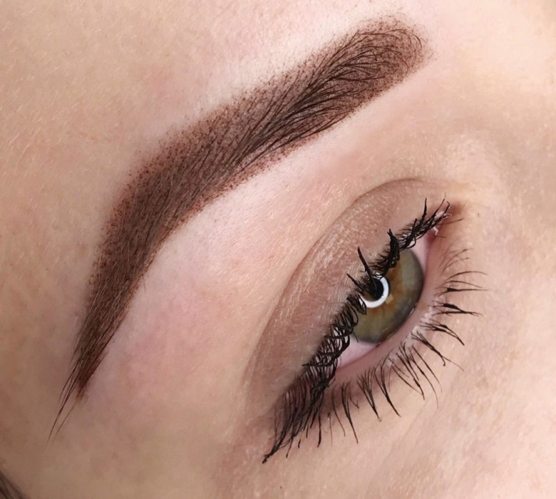 Пигмент наносится под кожу сотнями крошечных точек, которые создают “распыленный” эффект – в отличие от микроблейдинга, где пигмент вводится после выполнения надрезов. Результат — аккуратная форма бровей без чётких графичных линий.