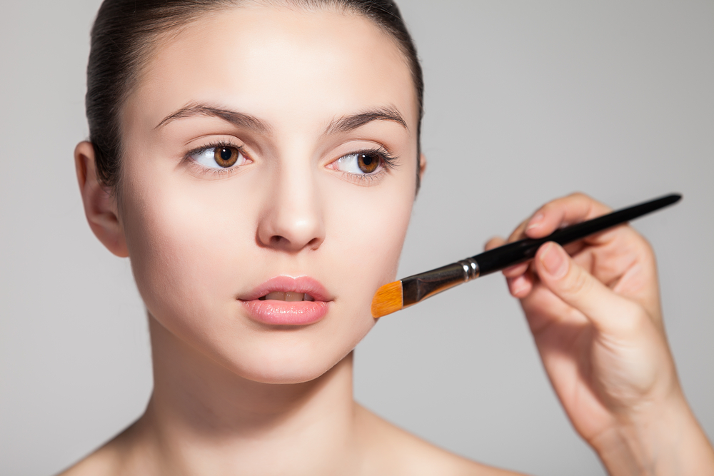 - Ее наносят кисточкой, легкими движениями на все лицо и шею;
