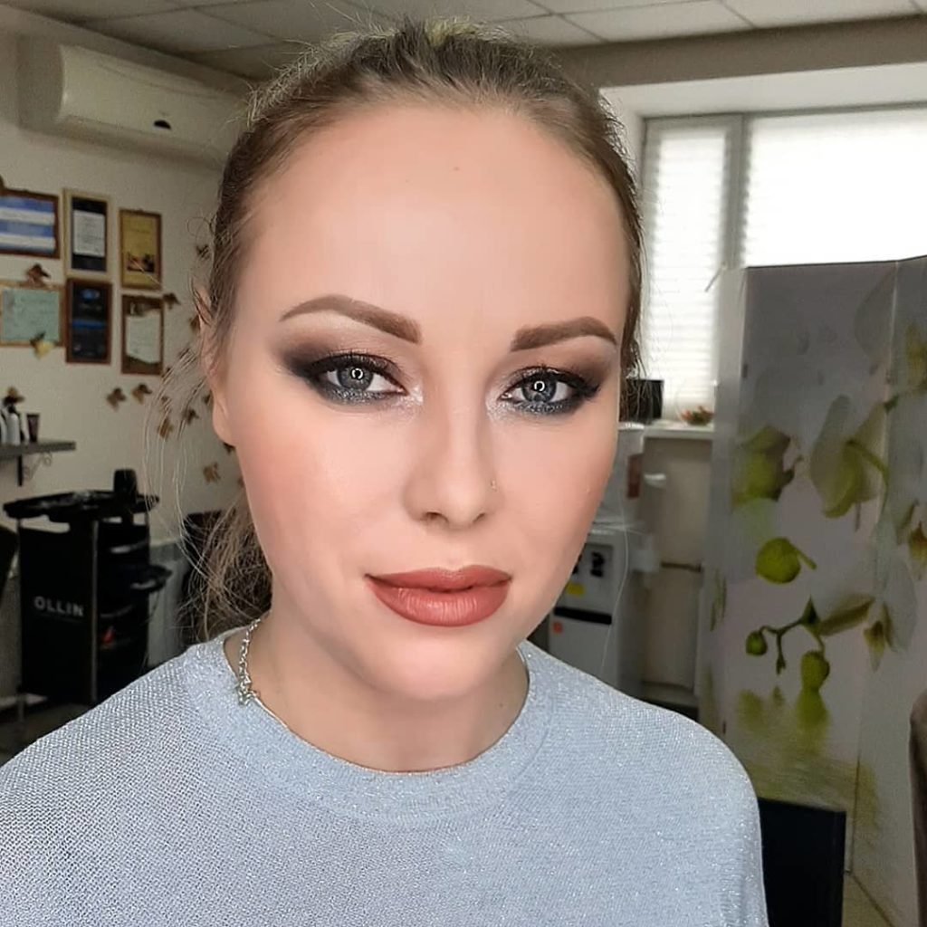 Выгодно подчеркнуть глаза и сделать их ещё ярче поможет смоки айс в черно-коричневых тонах. Для этого рекомендуется обвести по контуру угольным фломастером, оттенить верхнее подвижное и нижнее веки коричневым. Румянец – персиковый, помада – бежевая с толикой розовинки.
