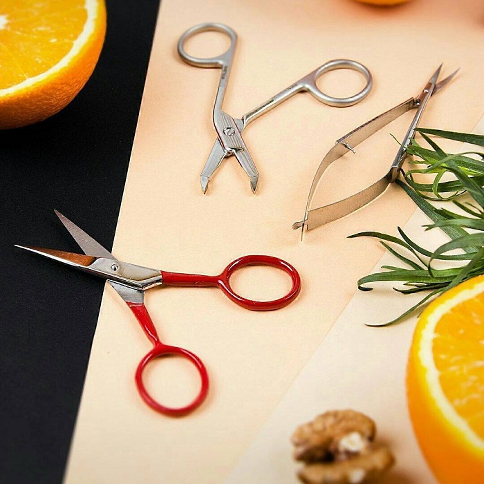 - Ножницы. Они могут быть маникюрными, классическими с прямыми лезвиями и специальными, предназначенными для того, чтобы подстричь брови. У них узкое лезвие и круглые края. Эти хитрости повышают безопасность процедуры, можно подстричь ими без травмирования век. Материал изготовления таких ножниц – нержавеющая медицинская сталь. Кроме того, ими можно подстричь волосы у самого корня. Такой инструмент можно купить в специализированных косметических магазинах. Он рекомендуется для тех, кто проводит процедуру впервые.