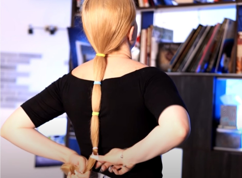5. Для формирования хвостов будут использованы две резинки. Третью и четвертую необходимо завязать на том уровне хвостиков, где планируется делать срез. Если есть сомнения, то резинки стоит завязывать несколько ниже. Укоротить длину всегда можно, а вот вернуть ее назад не получится.