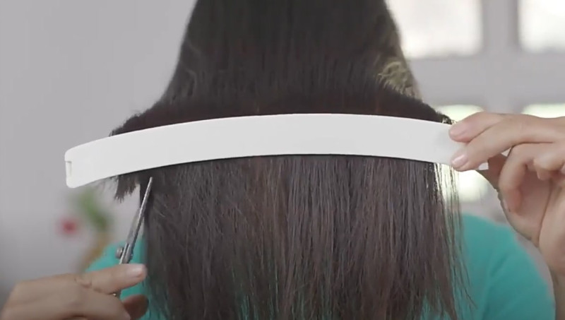 - Опустите резинки до нужной линии разреза. Концы следует обрезать острыми ножницами от лица к затылку, в результате получится эффектная V-образная прическа.