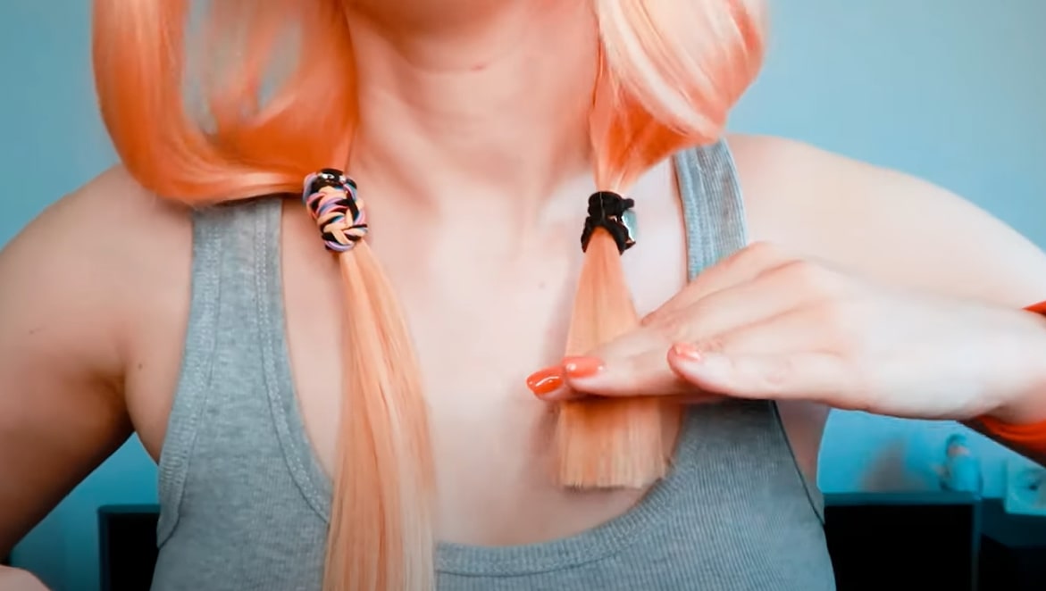 - Возьмитесь одной рукой за нижнюю часть волос. Другой: перерезать точку фиксации второй резинкой.