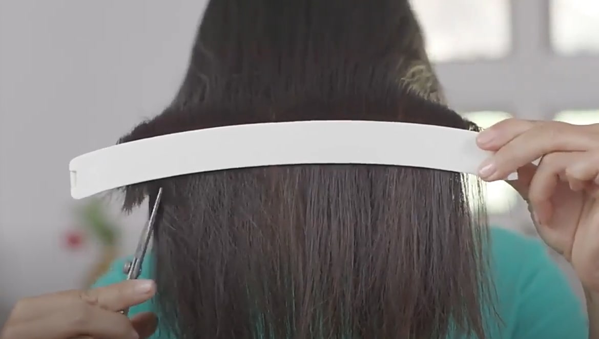 Наклонитесь вперед, наденьте прибор на волосы, отмерьте желаемую длину. При этом слой нужно поддерживать, а секущиеся концы подрезать.