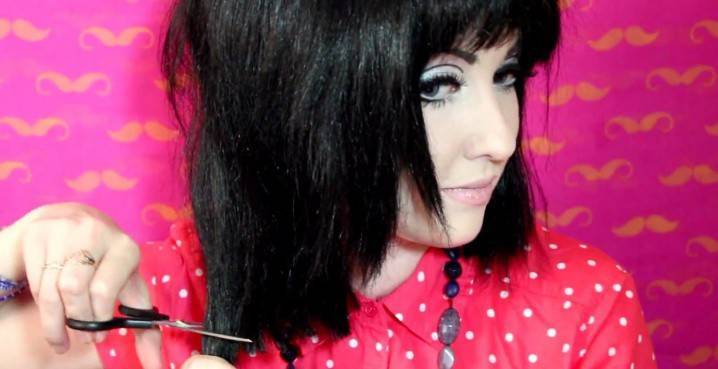 - Опустите резинки до нужной линии разреза. Концы следует обрезать острыми ножницами от лица к затылку, в результате получится эффектная V-образная прическа.