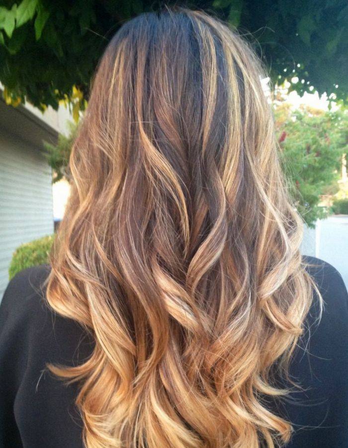 Балаяж умопомрачительно смотрится на длинных , по разному завитых волосах. Игра красок при свете будет моделировать иллюзию объема и струящихся прядей. Натуральные темные локоны – ничего лучше этой основы для неординарного мелирования не придумали. Именно такой расклад дозволяет парикмахеру включить свою фантазию и применить талант по полной, экспериментируя с совершенно разными красками.