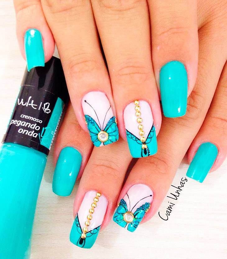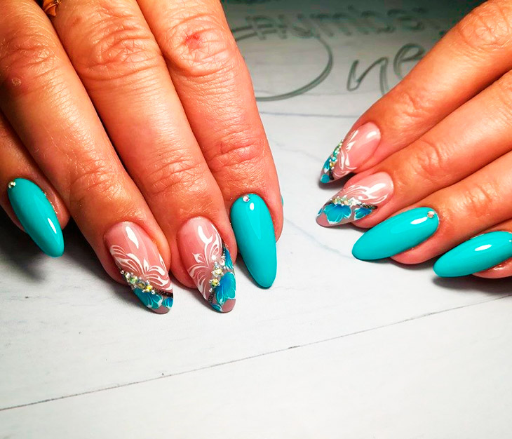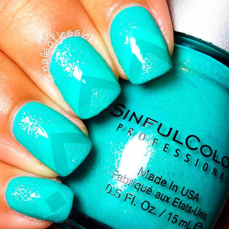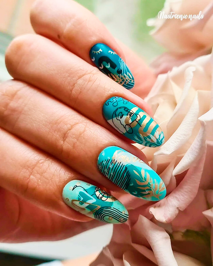 Полутонов у бирюзы много, и всегда можно найти для себя трендовую идею для уникального нейл-арта. Бирюзовый категорично лаконичен, что выглядит нетривиально и очень притягательно в моно-исполнении.