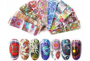 Для новичков этот вариант наиболее оптимален, так как выбор узоров огромен, а цена минимальна. Переводная фольга выпускается в рулонах, упакованных в миниатюрный флакон из пластика. Наносить её можно как на гель, так и на обычный лак.