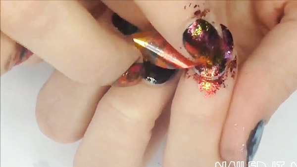 Переводная фольга действует как любые переводные узоры. Матовой стороной её прикладывают к ногтю, плотно раскатывают и отрывают.