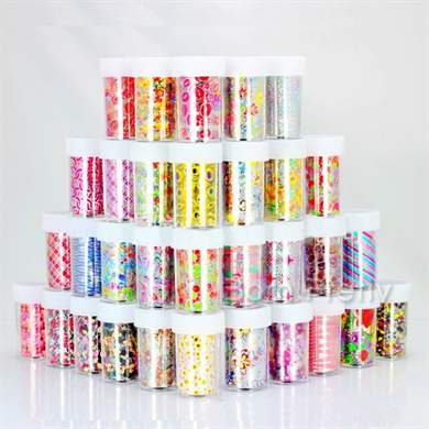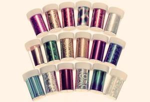 Продаётся она также в рулонах, в небольших круглых баночках. Имеет разнообразные расцветки и узоры. Поэтому любая девушка может выбрать себе подходящий для неё рисунок. Если вы хотите полностью покрыть ногтевую пластину переводной фольгой, то лучше использовать золотистую, серебряную или зеркальную фольгу.