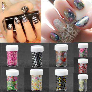 Можно приобретать фольгу в виде мелкой крошки, но удобнее всего брать её в рулонах, чтобы вырезать необходимый для своего ногтя рисунок. Для праздничного маникюра можно выбрать яркие расцветки фольги, а также с помощью неё можно создавать различные мозаичные узоры.