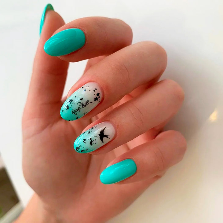 Школьницы подросткового возраста могут экспериментировать с сочетаниями и техниками выполнения бирюзового маникюра. Предпочтительнее короткие или средней длины ногти, овальной или миндалевидной формы.