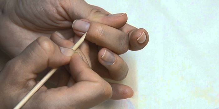 Перед тем, как начать какие-либо действия, необходимо вымыть руки с мылом и насухо вытереть бумажным полотенцем. Если на ногтях осталось старое покрытие, необходимо снять его при помощи жидкости для снятия лака. Лопаткой для кутикулы нужно поддеть и отодвинуть кутикулу по направлению к основанию ногтевой пластины. Кожу по бокам от ногтя тоже с помощью лопатки необходимо отодвинуть от ногтя. Теперь необходимо аккуратно срезать поднятую кожу над кутикулой