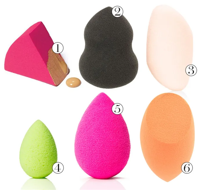 1 — треугольный спонж; 2 — грушевидный блендер; 3 — наклонный блендер; 4 — мини-блендер для труднодоступных участков; 5 — классический спонж в форме капли; 6 — скульптурный блендер.
