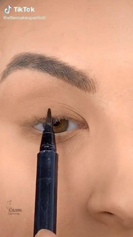 Веки тонируются при помощи базовой основы с последующим нанесением теней, начиная от внешнего угла глаза к внутреннему. Карандаш может использоваться как под тени, так и поверх них. Чтобы зрительно расширить глаза нужно провести тонкую линию у основания ресниц верхнего века.