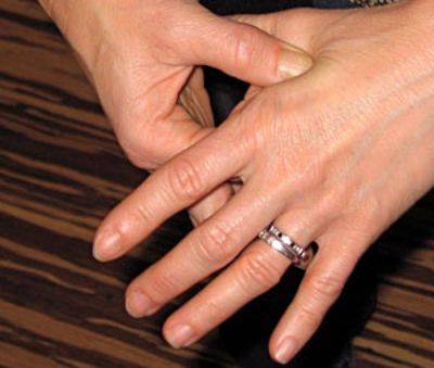 - кончиком большого пальца левой руки надавливают на основания пальцев правой;