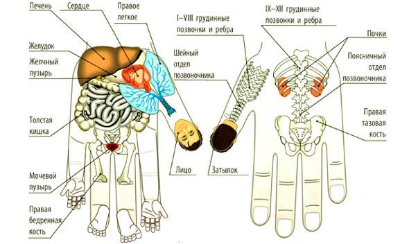 На руках, так же, как на стопах и ушных раковинах находятся акупунктурные зоны, на них проецируются все важные органы человеческого организма.