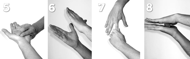 возьмите одну руку в другую и большим пальцем растирайте внутреннюю сторону ладони, перемещаясь вверх до кончиков пальцев;