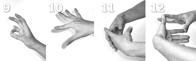 11. Кроме больших пальцев, остальные в замке. Вращение по часовой стрелке и против нее больших пальцев вокруг друг друга.