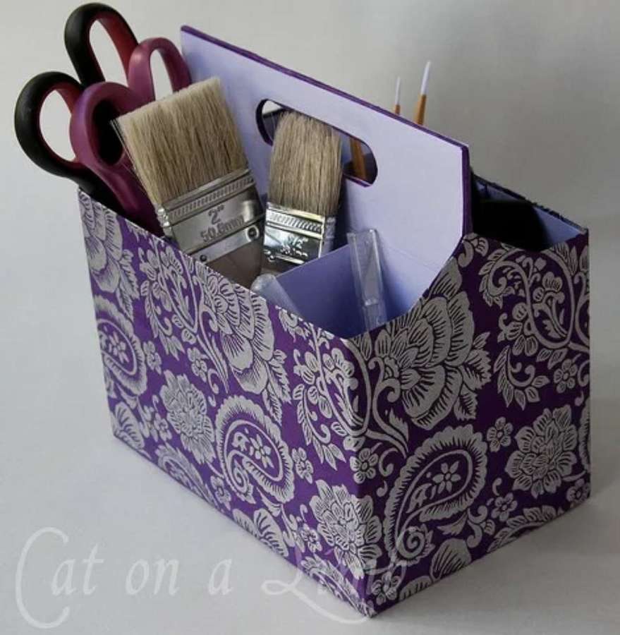 Еще один симпатичный органайзер своими руками. Картонную коробку, для более аккуратного вида, вы можете обшить/обклеить тканью.