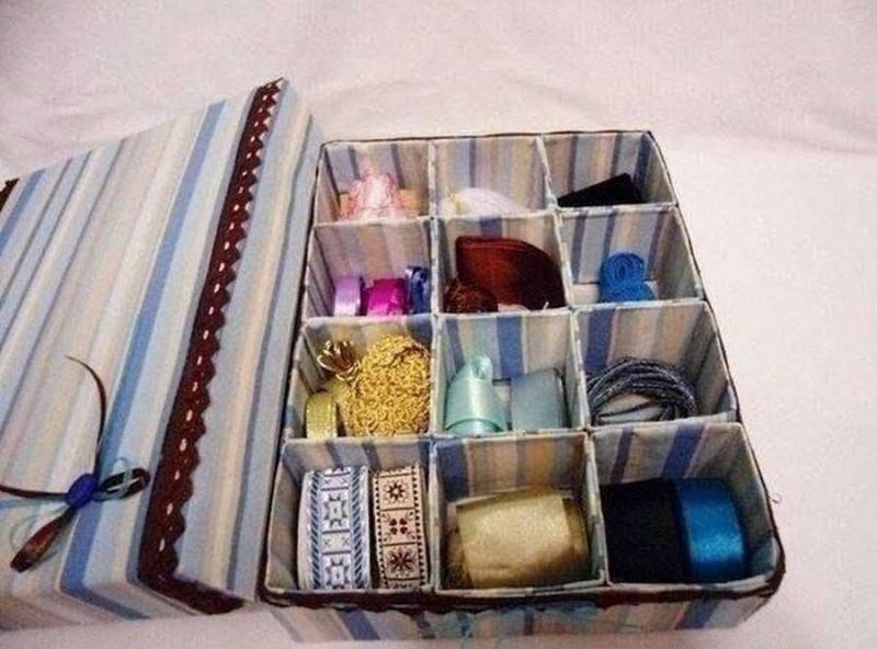 А вот и очень простой способ организовать вещи для шитья и рукоделия. Обычные картонные вкладыши-разделители не дают содержимому шкатулки перемешаться.