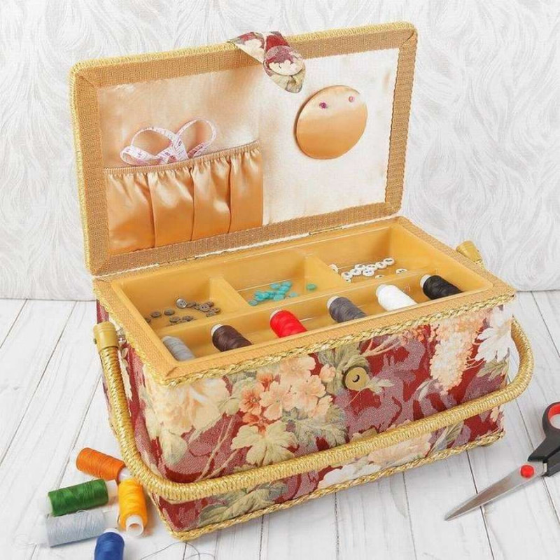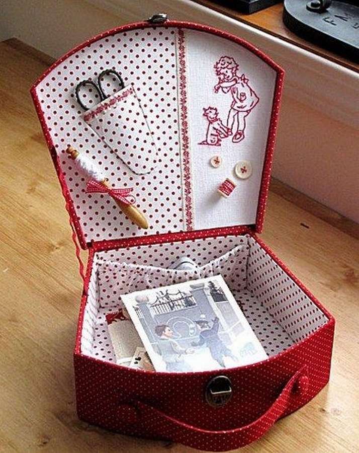 Взгляните на чудесный вариант выполнения шкатулки-органайзера для шитья своими руками. Из остатков ткани и поролона можно даже смастерить подушечку для иголок.