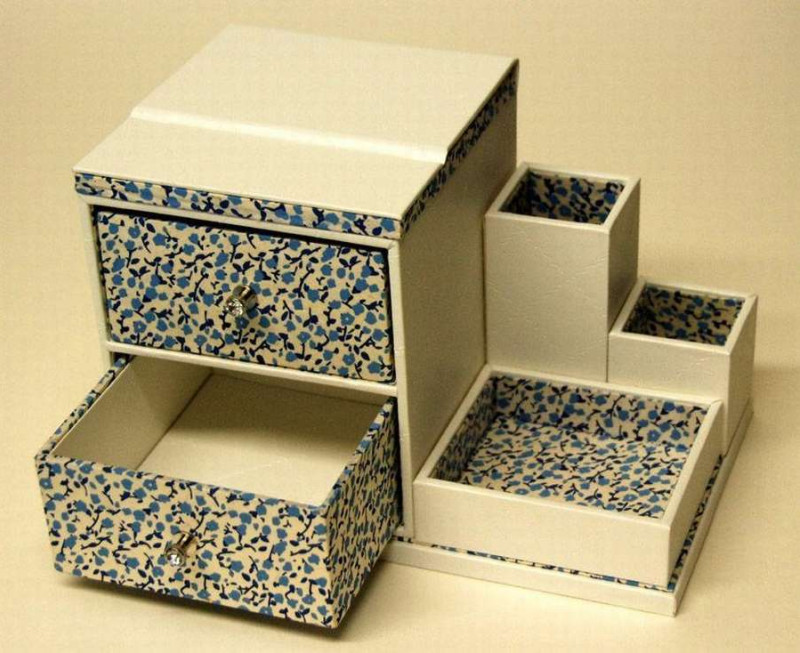 К примеру, вот такая нестандартная конструкция может быть создана из обычного картона. Ящик подождёт для цепочек и объемных сережек, а небольшие открытые «шкатулочки» – для колец и браслетов.