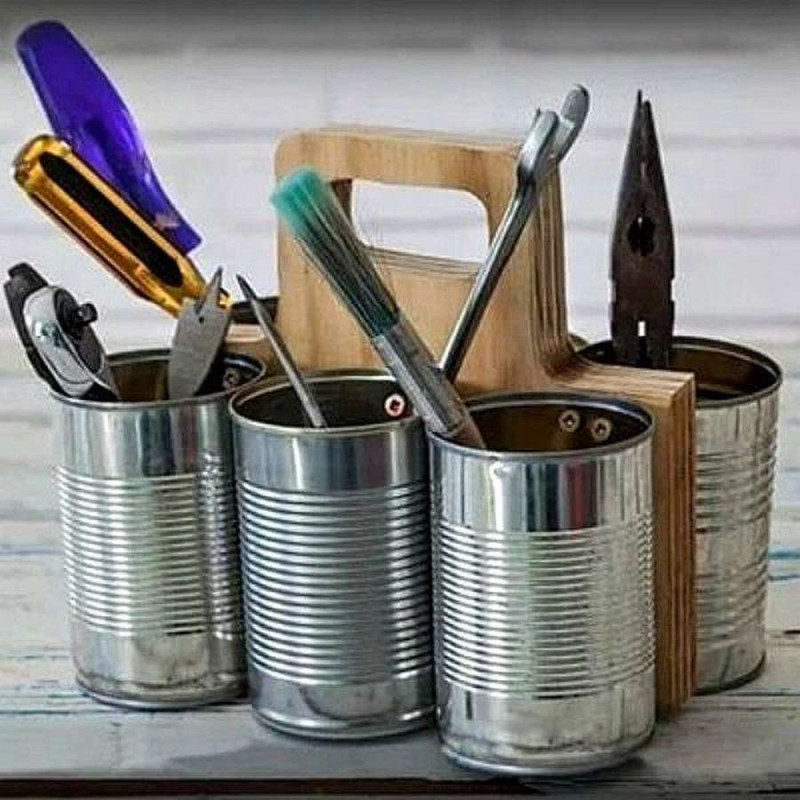 Если у вас есть жестяные банки и деревянная доска, считайте, половина дела сделано. Советуем скреплять поделку вместе с помощью болтов/винтиков.