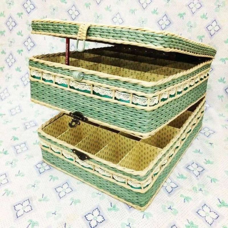 Нестандартная форма шкатулки-органайзера представлена ниже. Такой «сундучок» с двумя ярусами сделать абсолютно не сложно, однако следует выбирать плотный и крепкий материал. Пусть основой будет картон, но его обязательно нужно укрепить дополнительно. Например, «вязкой» из пластиковых пакетов.