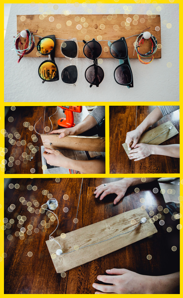 Чтобы сделать такой органайзер, в доске нужно просверлить отверстия и протянуть в них петельки из верёвки или шнура. Очки цепляются дужками за петельки.