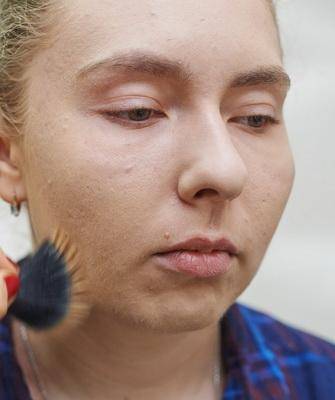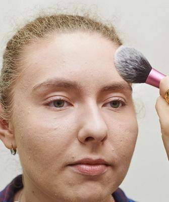 - Чтобы применить бронзатор, используйте кисть для пудры, чтобы нанести легкий слой над всеми областями лица, которые естественно затронуло бы солнце – это лоб, щеки, подбородок и переносицу .